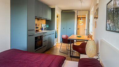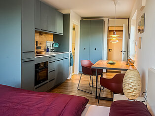 Das Hauptzimmer verfügt über eine sehr gut ausgestattete Küchenzeile mit modernem Backofen mit vielen Funktionen (auch Mikrowelle) und Induktionsherd, Kühlschrank mit Gefrierfach. Essig, Öl, Zucker, eine große Auswahl an Gewürzen, Tees und Kaffee werden kostenlos bereitgestellt. Das Zimmer ist außerdem mit einer Lüftungsanlage ausgestattet.