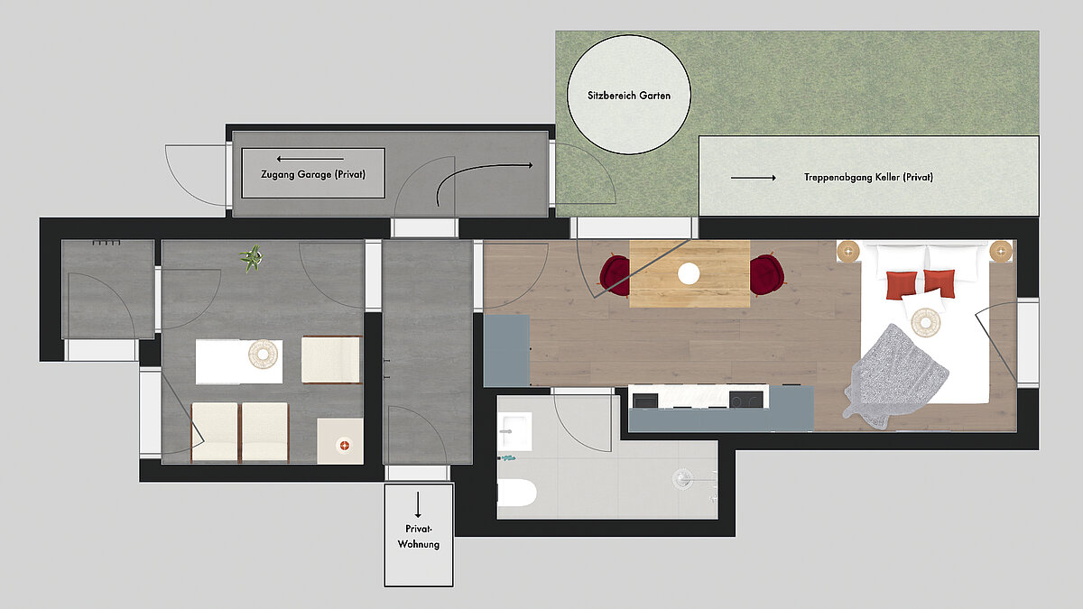 Zusätzlich dient uns der Flur als Durchgang von der Privatwohnung zur Garage, der aber während der Vermietung nicht genutzt wird.