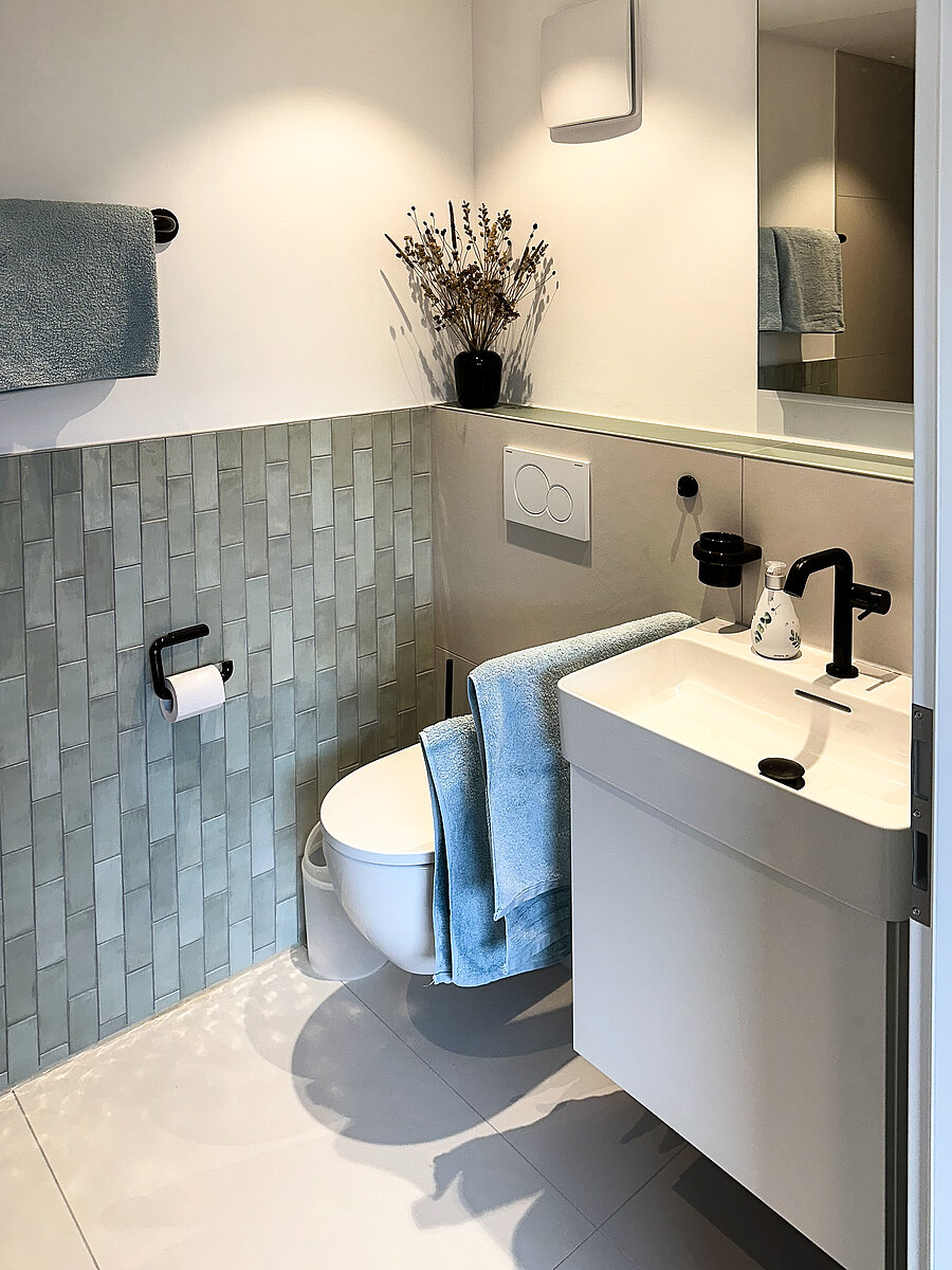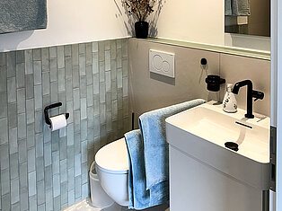 Das barrierefreie Bad mit bodengleicher Regendusche ist stufenlos zugänglich und verfügt über eine Fußbodenheizung, eine zuschaltbare Lüftung und ausreichend Platz im Waschtisch-Unterschrank..