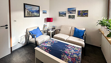 Im ehemaligen Wartezimmer befindet sich nun ein kleiner Aufenthaltsraum (mit bequemer Sitzgelegenheit und höhenverstellbarem Tisch), von dem aus man über den Flur (mit Abstellmöglichkeit und zwei großen Kleiderhaken) in den Wohn-, Schlaf-, Küchenbereich kommt.