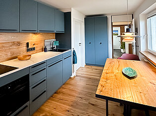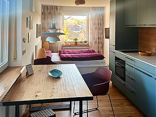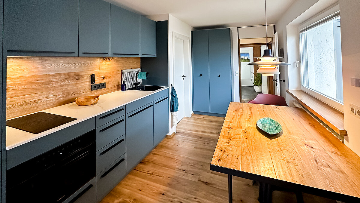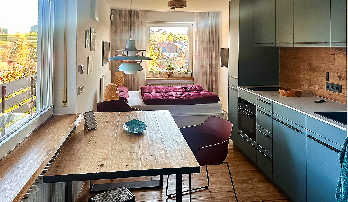 Moderne und gut ausgestattete Küche, großzügiger Esstisch und gemütliches Bett mit Blick in Richtung Berge.