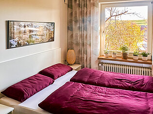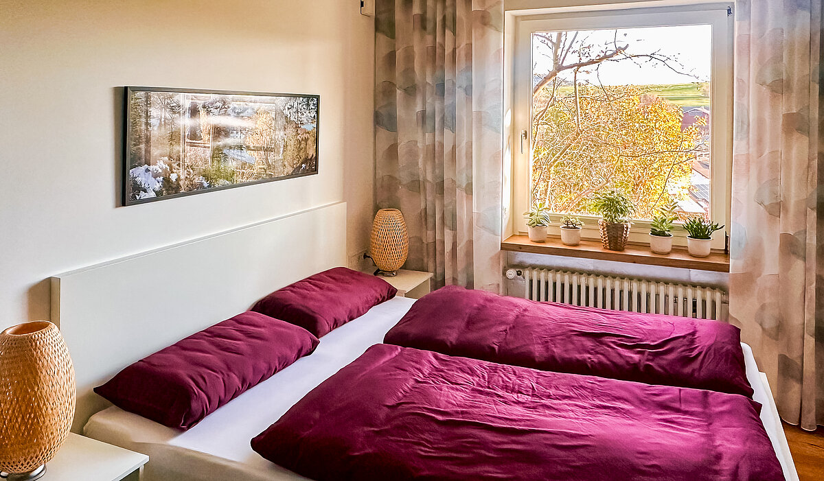 Bei Bedarf ermöglichen Verdunklungsplissees am Fenster beim Bett einen erholsamen und entspannten Schlaf. Das Fenster am Tisch verfügt über ein blickdichtes Plissee, welches nicht abdunkelt, aber flexiblen Sichtschutz bietet. Zum Abdunkeln gibt es einen Außenrolladen.
